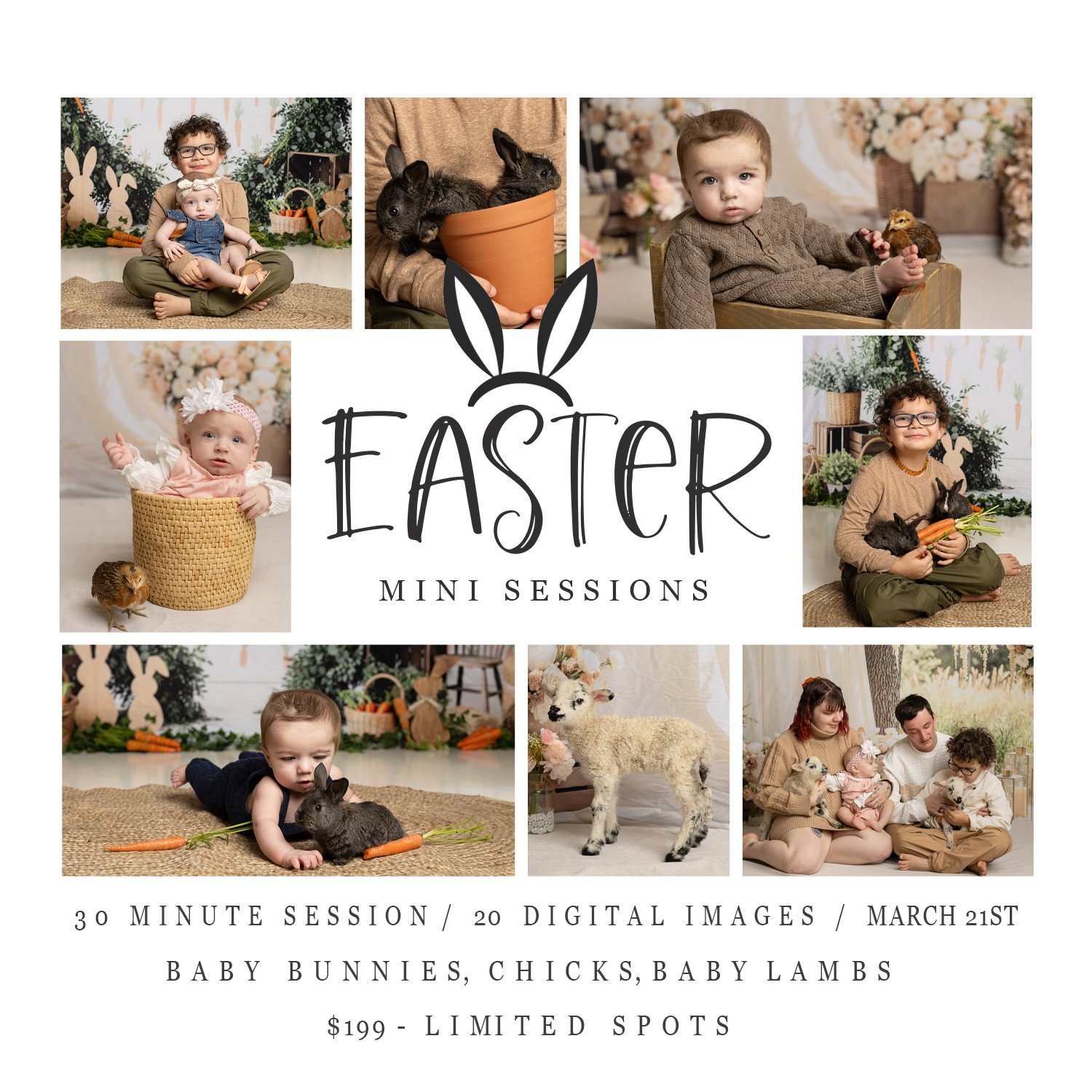 Hop on down to the Donnelly Photography studio to capture some special Easter/Spring portraits on March 21st. We have two sets this year and can accommodate families in them. We have baby bunnies, chicks and even some adorable baby lambs to snuggle with. Sessions are 30 minutes long and include 20 digital portraits.